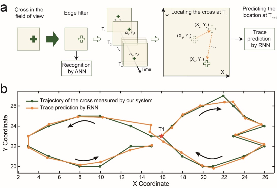 图4,用于动态视觉任务的类脑视觉系统。(a)类脑视觉系统用于运动追踪的流程图。利用视网膜形态传感器,对视野中的 "十"字目标进行边缘特征提取,并将"十"字目标的坐标以时序信息形式输入循环神经网络,对下一时刻该目标的轨迹进行预测。(b)类脑视觉系统经过运动追踪获得的"十"字目标物运动轨迹(绿色线)与经过轨迹预测获得的"十"字目标物运动轨迹(橘黄色线)基本一致。
