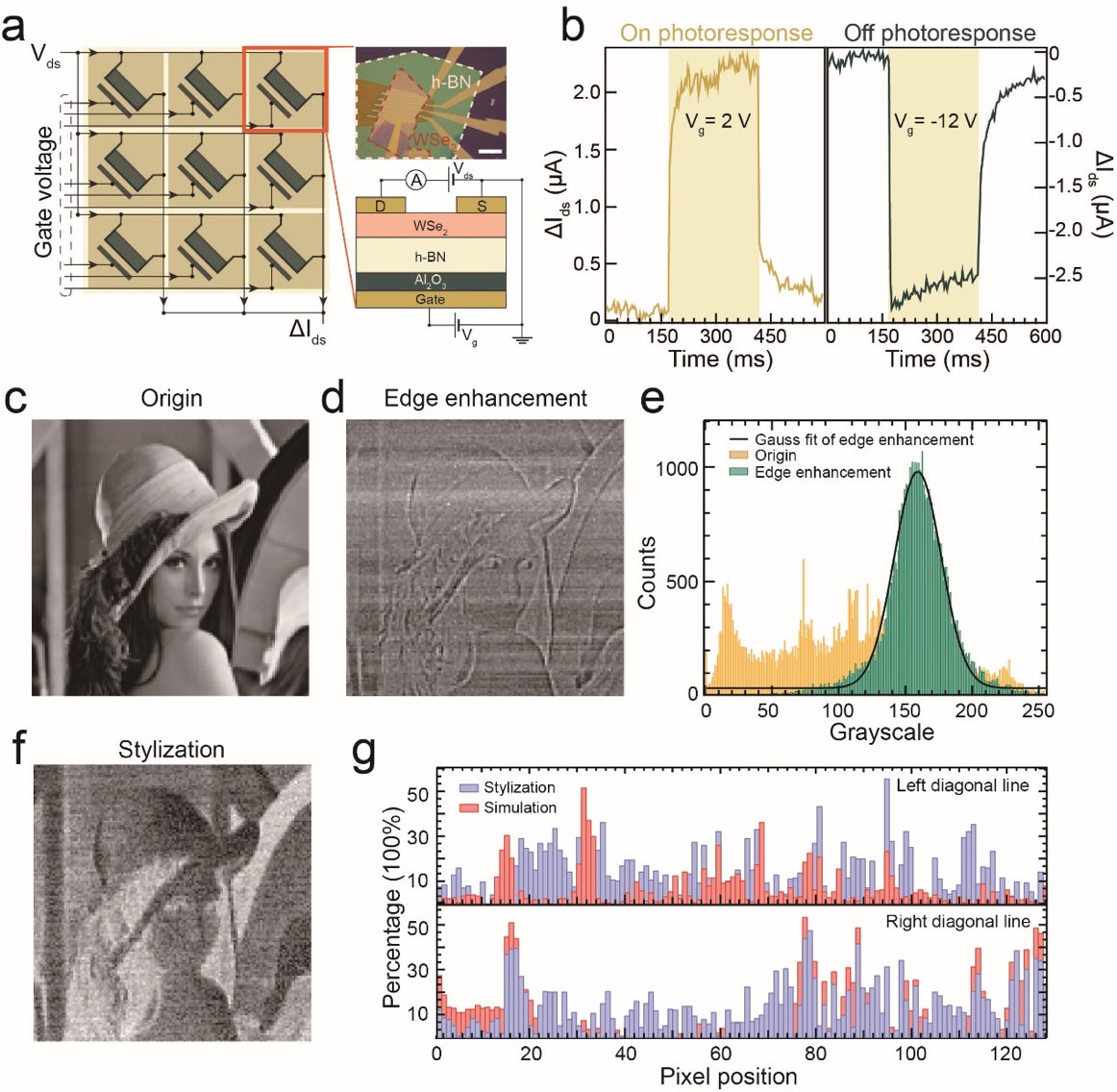 图2,视网膜形态的传感器阵列及图像预处理功能。(a)按照3×3阵列排布的视网膜形态传感器阵列,单个器件结构如光学图片所示。(b)在背栅调控下,器件展示出正负光电流响应。(c)用于图像预处理的Lenna原图。(d)经过边缘增强处理过的Lenna图片。(e)对Lenna图的边缘增强结果进行评估,处理后的图片的灰度值(绿)呈现出高斯分布。(f)经过风格化处理的图片。(g)对Lenna图的风格化结果进行评估,处理后的图片与模拟值呈现相似的灰度值排布。