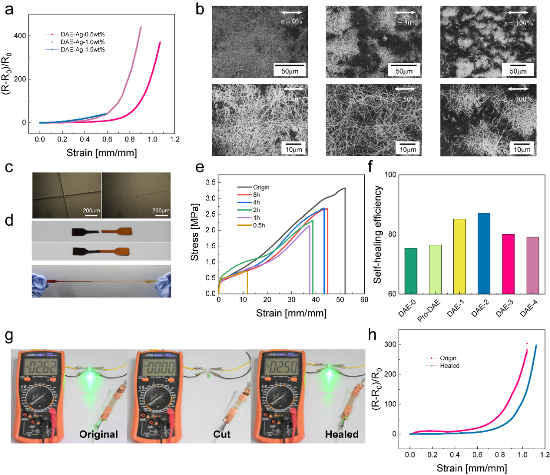 进一步研究人员以该弹性体作为基底,在表面喷涂银纳米线,得到了可拉伸高粘附的生物界面电极。该电极材料具有较好的拉伸导电性(>100%)和优异的室温自修复性能(η≈86%)。 这些性能保证了电极材料在实际应用中监测信号的连续性和稳定性。