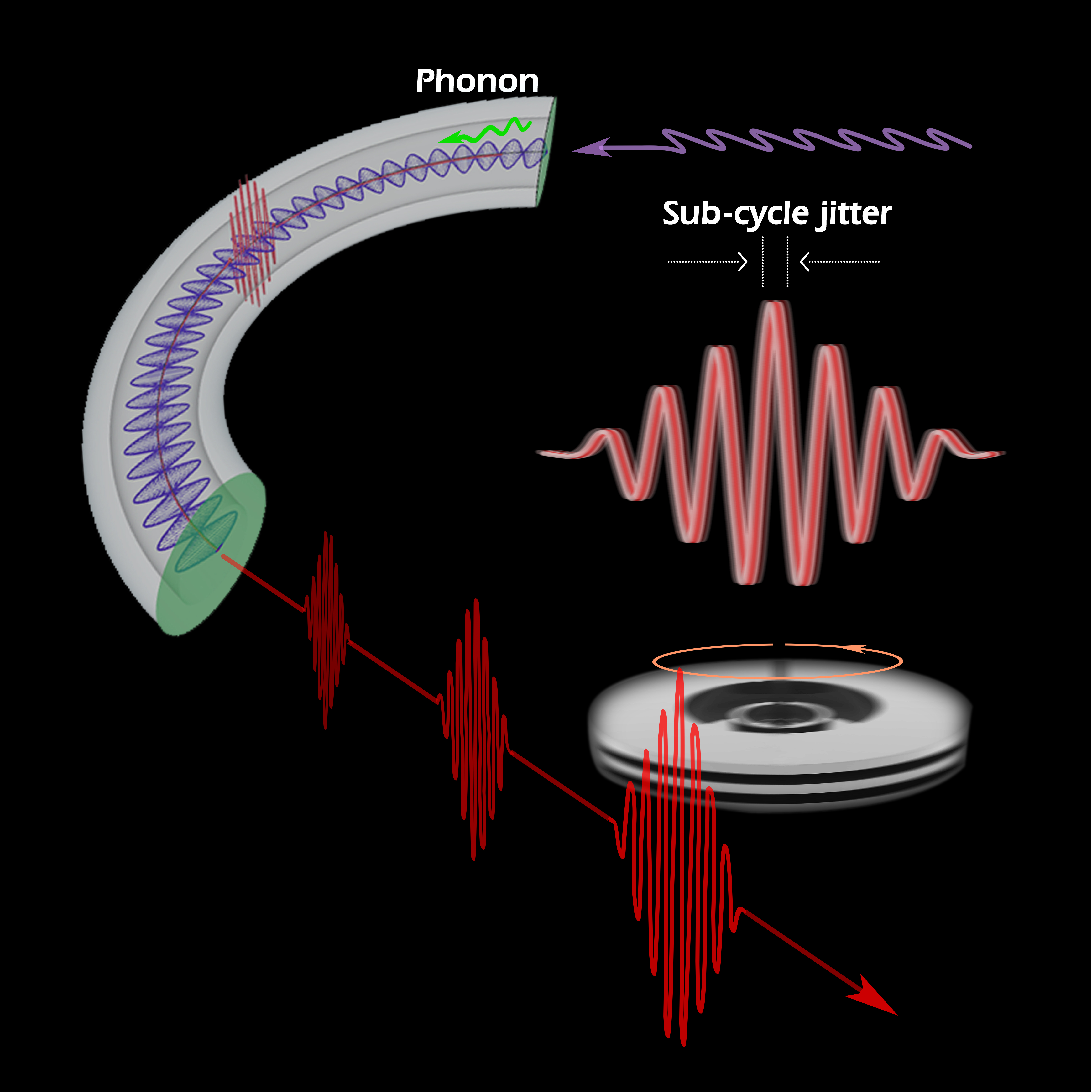 "光子飞轮"概念首先由光频梳研究先驱、汉堡大学Franz X. Kärtner教授提出,类比于机械飞轮,采用光学方法产生高重复性和低抖动的周期性信号,可以实现目前人类所能达到的最精密的时间标准,因而微波光子学、精确授时、遥感定位等领域具有重要应用价值。"光子飞轮"已经可以在基于飞秒锁模激光器的光频梳中实现,但是其结构复杂、体积重量较大、受环境影响大,通常只能在实验室里运转,且重复频率通常限制在1GHz以下。而光学微腔中的克尔孤子光梳可以大大缩小系统的体积、提升环境适应性,有望实现现场可部署器件。然而片上光学微腔的量子噪声极限较高,且噪声水平进一步受到泵浦激光器噪声和光孤子热稳定性限制,现有的相位噪声和时间抖动水平无法达到"光子飞轮"级别。