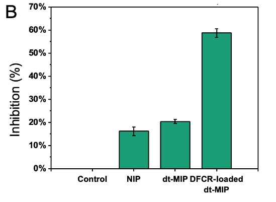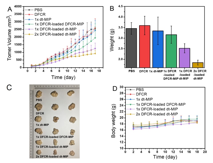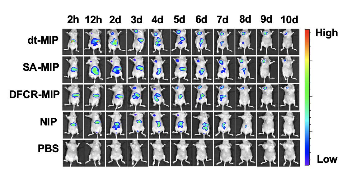 作者通过共聚焦荧光和流式细胞术,证明了dt-MIP对于癌细胞的靶向能力(图2)。紧接着,作者证实了载药dt-MIP可以被pH = 6.8的酸性微环境触发,可控释放药物(pH = 7.4时不释放)。同时,载药dt-MIP与HepG-2共孵育48h后,细胞抑制率为58%,证实了载药dt-MIP的细胞毒性 (图3)。同时,作者考察了不同材料在荷瘤裸鼠体内的分布,相比于非靶向的纳米粒子,dt-MIP可以在肿瘤部位保留更长的时间(10天)(图4)。最后,作者考察了载药dt-MIP的抑瘤效果,相比起空白对照组(PBS)和裸药对照组(DFCR),载药dt-MIP具有最佳的肿瘤抑制效果(图5)。