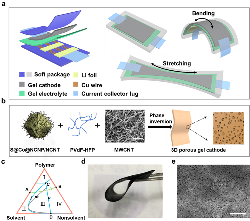 图1. 柔性可拉伸锂硫电池的器件结构示意图、三维多孔凝胶硫正极的制备过程与结构表征。
