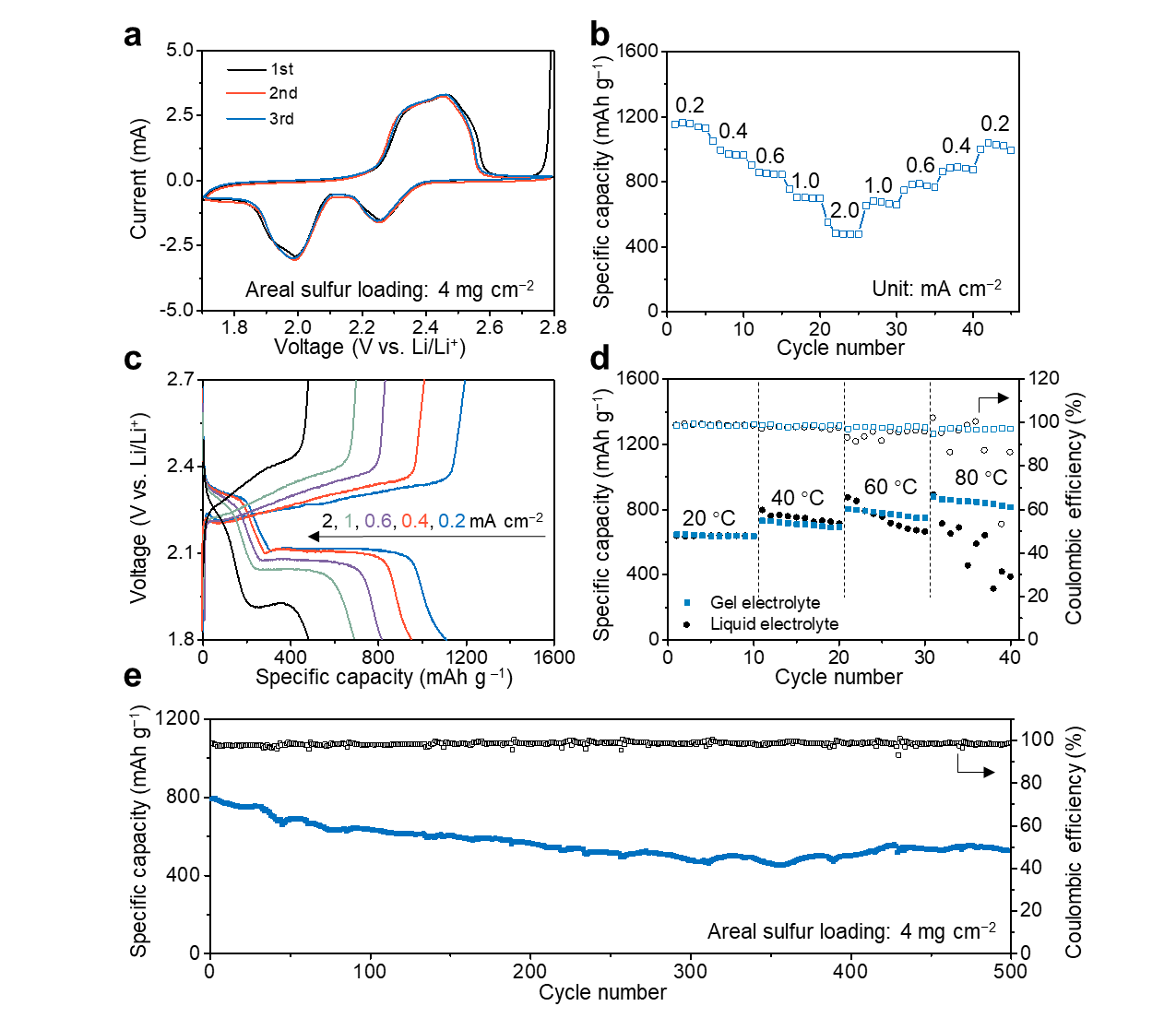 图4. 柔性可拉伸锂硫电池在高面积载硫量下的性能对比测试。