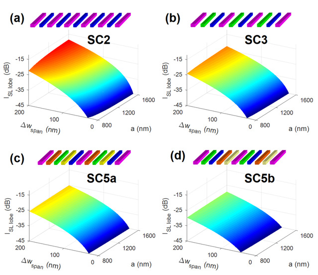 此工作发展了基于波导超晶格的光学相控阵的基本理论,阐明了波导超晶格的非均匀性带来的主要影响表现为由超晶格结构诱导出的一类次光束(可称为"超晶格瓣");并给出了抑制此类次光束的方案。为保证光学相控阵的工作,需要抑制不同波导间的模式耦合(即信号串扰)。波导超晶格将不同宽度的波导组成超元胞,从而使不同波导中模式的传播常数产生差异,以此抑制波导间的模式耦合。此前该组的研究已经给出抑制串扰的理论。此次工作中的基于波导超晶格的光学相控阵理论表明:为抑制"超晶格瓣"这种次光束,原则上波导超晶格的非均匀性应当尽可能小。而抑制串扰要求不同波导的模式传播常数有较大差异,即波导超晶格的非均匀性应当足够大。两种需求之间产生了矛盾。针对此问题,该课题组发现超元胞内光的横向相干性可用来调控光束特性;且当超元胞较大时,可提供足够多的光调控自由度来抑制"超晶格瓣",进而发现了均衡抑制次光束与波导间串扰的理论依据。最终找到了一种波导超晶格结构(SC5b)可使相应的光学相控阵性能比较接近理想的半波长阵元间距的均匀光学相控阵的性能。