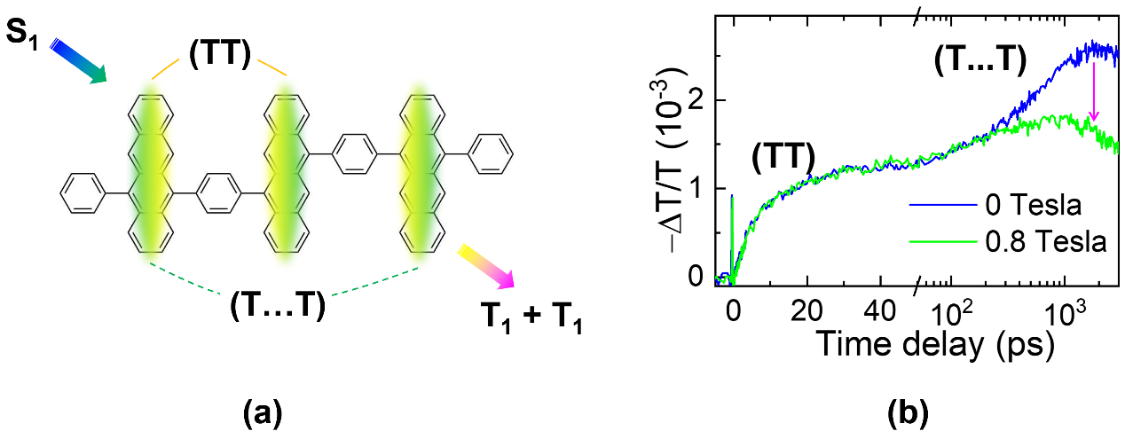 图1.(a)近邻(TT)和空间分离(T…T)三线态激子对中间态媒介的单线态裂分双通道示意图;(b)T…T态生成动力学的外磁场调控。