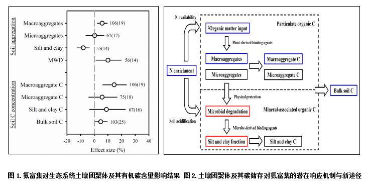 由于我国农业活动和化石燃料燃烧导致的氮沉降在过去几十年里急剧增加,氮沉降可通过增加陆地生态系统碳固存来减轻人为二氧化碳排放的负面影响。陆地生态系统氮调控土壤碳收支的潜在机制和途径仍不太清楚,越来越多的证据表明,过量氮添加导致的复杂土壤碳相关过程导致地上-地下碳动力学解耦。土壤团聚体是土壤结构的主要组成部分,按粒径分为大团聚体(>250 μm)、微团聚体(53-250 μm)和粉砂-粘土组分(<53μm)。大团聚体中含有植物残体,形成颗粒有机碳(POC)池,而矿物伴生有机碳(MOC)池与粉质黏土相结合。由于土壤团聚体在物理上保护有机碳不受微生物降解,因此土壤团聚体的稳定性对土壤碳的固存有着重要的影响。平均权重直径(MWD)是一种通过其平均分数尺寸对不同尺寸类别进行加权的指数。因此,随MWD越大,被分析样品中的颗粒越大,越稳定。有关氮添加对土壤团聚体影响的报道并不一致,这可能是由于氮处理条件和生态系统类型的差异。中国正经历着强烈的N排放污染,已成为世界上最大的活性氮排放国。考虑土壤团聚体对土壤碳库的重要性,需要进一步研究氮沉降如何影响土壤团聚体和碳在土壤团聚体中的固定和积累过程等(图1-图2)。
