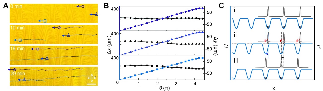 图 4. 转动-平动转换 (A) 微球粒子单向输运,比例尺50 μm,(B) 横向Δx和纵向Δy位移与旋转角度θ的关系,(C) 光驱动微球输运的势能分析。