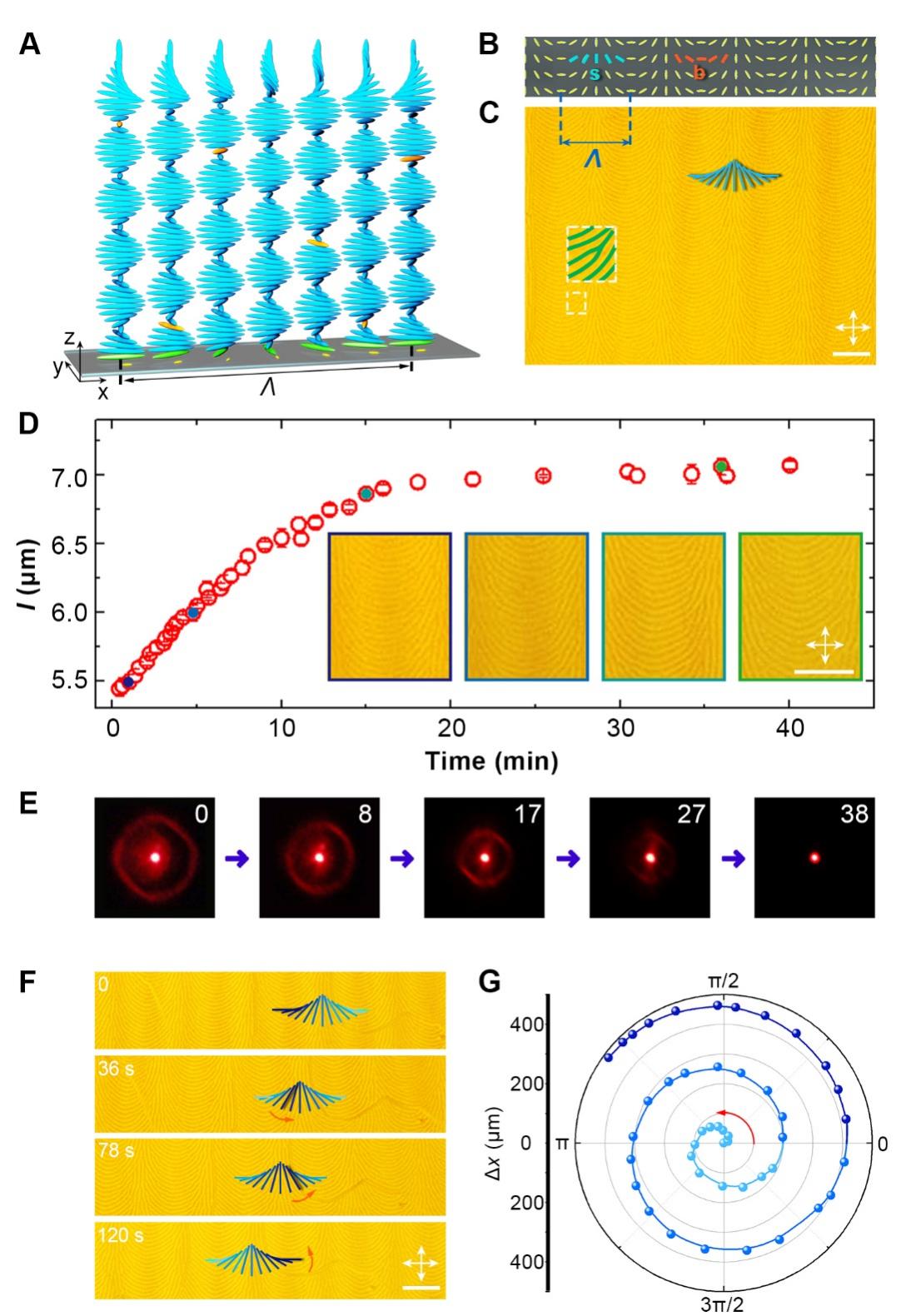 图 2. 均匀取向半开放胆甾相液晶薄膜 (A) 螺旋结构示意图及周期性相位变化,(B) 光驱动解旋过程及显微织构变化。比例尺20 μm