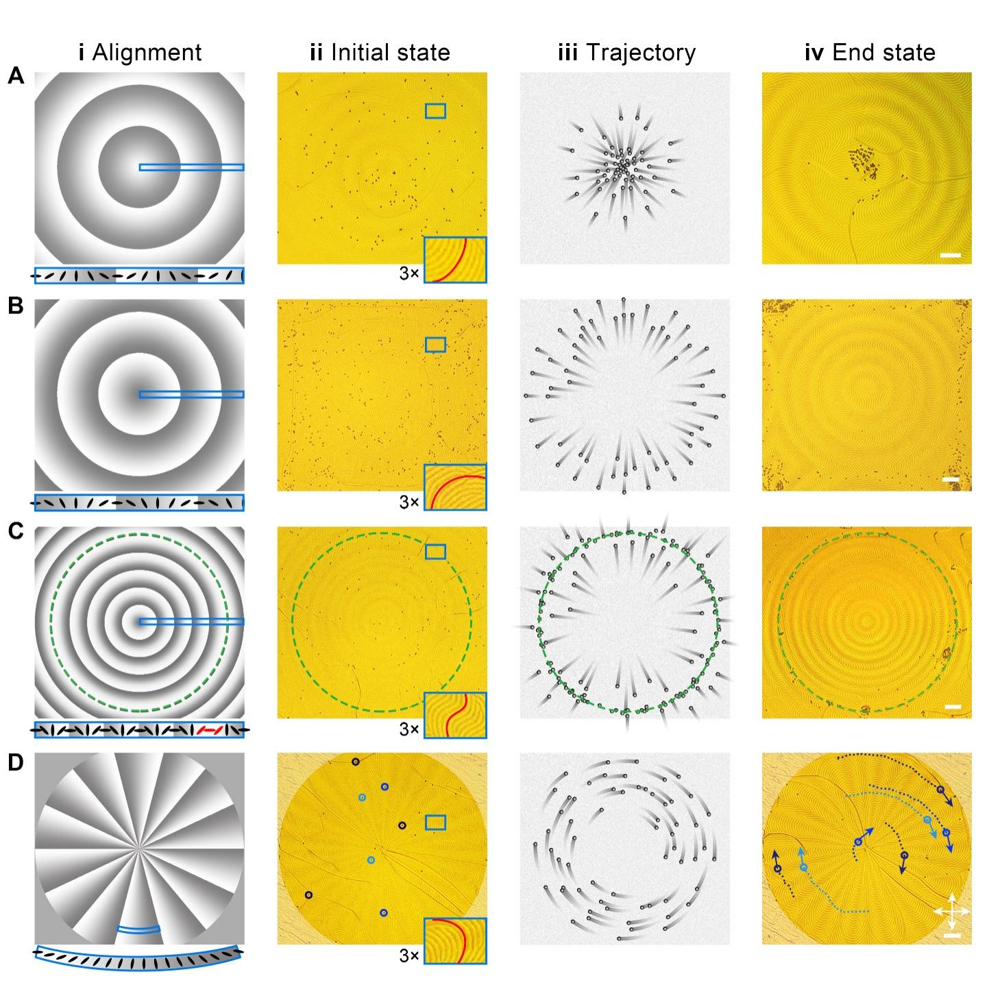 图 1. 可编程执行器实现微球 (A) 会聚,(B) 发散,(C) 定点聚集,(D) 轨道公转。从左往右四列分别展示了不同的基板配向设定,微球散布起始状态、移动过程和终态。比例尺50 μm