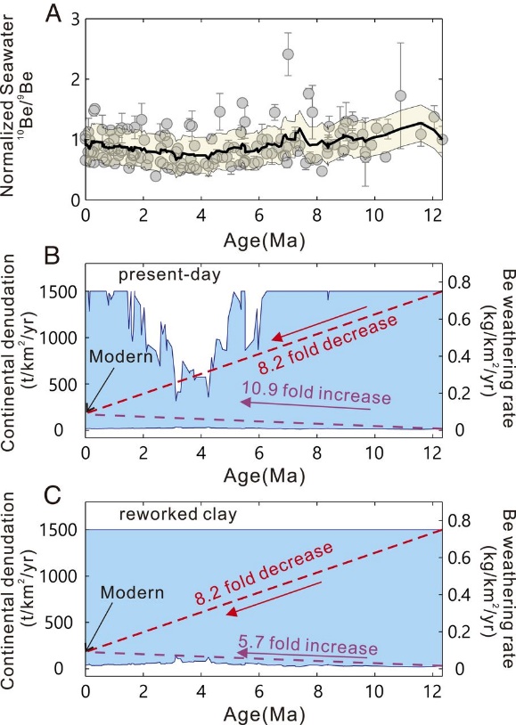 图1. 新生代海水Be同位素组成(A)与其对应的剥蚀-风化速率范围(B和C)