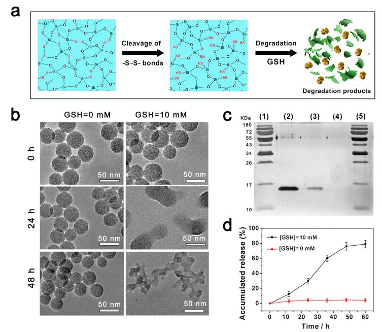 接下来,作者考察了SA印迹的 RNase A@BS-NPs的体外降解行为和蛋白释放效果。结果表明,SA印迹的 RNase A@BS-NPs在模拟的正常生理环境下具有良好的稳定性,而在高浓度的GSH还原条件下,二硫键打开,导致纳米载体逐渐降解 ,并且在与GSH共孵育48 h后,RNase A累计释放量达到~78% (图2)。