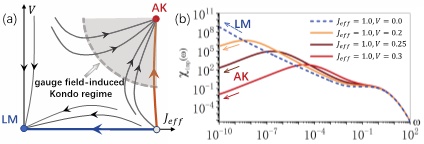 图2: 低能有效理论的重整化群流图和不动点。(a)解析重整化群计算发现除了局域磁矩不动点(LM)以外,在强耦合处会出现一个非对称近藤不动点(AK)。(b)数值重整化群计算获得的动态磁化率揭示了近藤不动点的费米液体行为,与解析结果吻合。