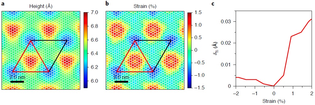 图4:0°转角附近高度和应力分布的DFT计算。(a, b)转角θ为1.7°时顶部 TiTe2层的相对高度和局部应变场;(c) 不同应变下钛原子的畸变。