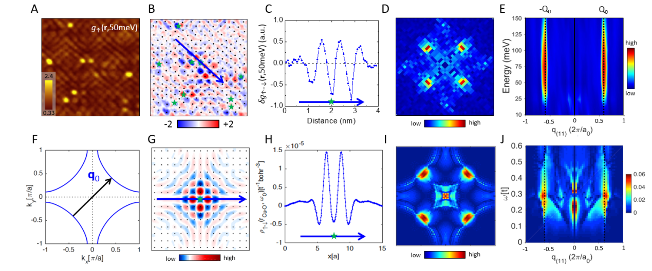 图2 在小的区域(A)内测量的空间自旋分辨的准粒子相干散射信号(B),能够看到反铁磁序的明显空间振荡(C),傅立叶变换的结果(D)能够看到明显的斑纹,这一反铁磁序在能隙以上很大范围内出现,且没有色散(E)。理论计算结果(G-J)和实验结果和基本一致。