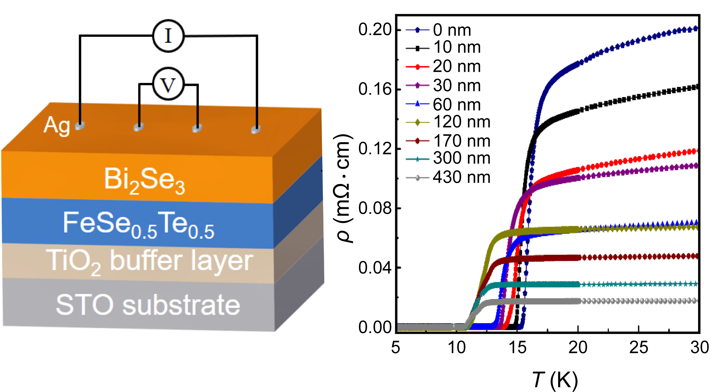 图1.(a)Bi2Se3/FST/TiO2/STO薄膜异质结构的示意图,(b)Bi2Se3/FST异质结构中不同Bi2Se3薄膜厚度的电阻率与温度曲线。