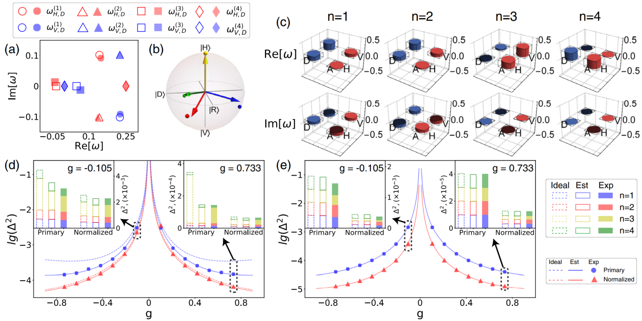 图3. 对偏振自由度SIC POVM进行直接表征的实验结果(a、b、c)与精度分析(d、e)。