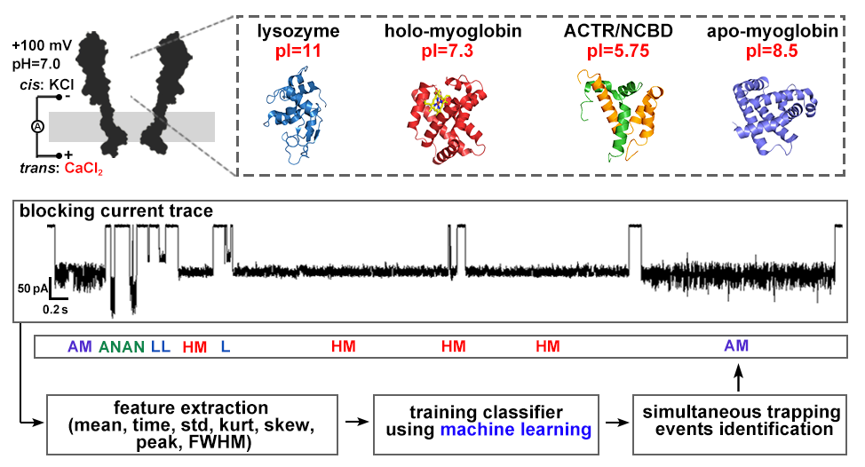 图1. 机器学习辅助MspA纳米势阱同时检测不同电荷蛋白质