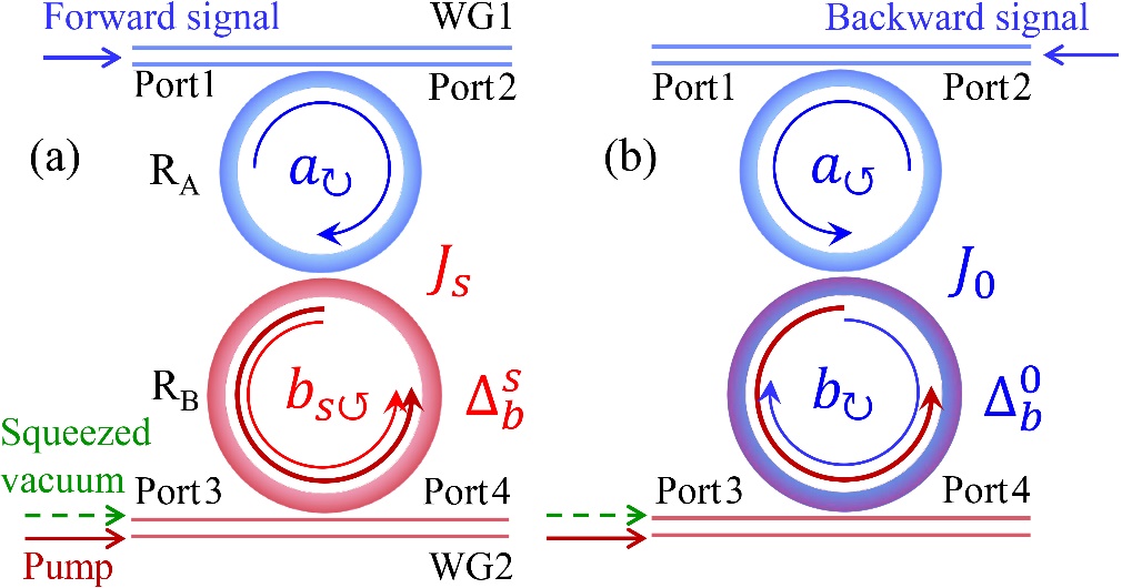 1 利用经典光泵浦铌酸锂微腔压缩腔模诱导光子——光子手性耦合实现非互易传输。(a)正向信号光入射,量子压缩调制的光子——光子耦合; (b)反向信号光入射,腔模相互作用不受量子压缩调制。