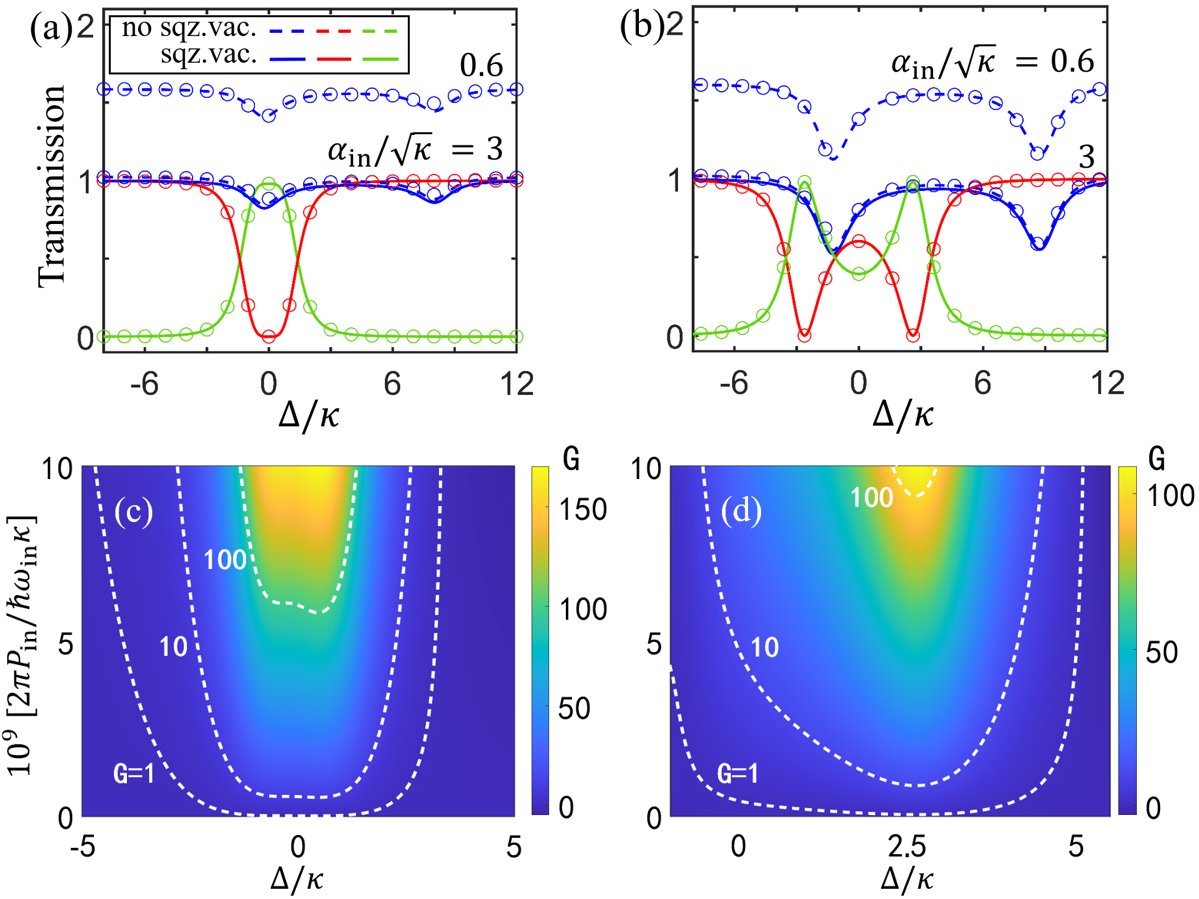 2 (a, b)光隔离与光环形器的透射谱红色曲线表示,蓝色曲线表示,绿色曲线表示(c, d)光子晶体管的增益