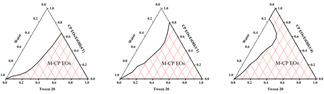 Fig. 2. Pseudo-ternary diagram of system with water/CP EOs/EtOH/Tween 20 with different weight ratios of CP EOs/EtOH: 4:1, 1:1 and 1:4.