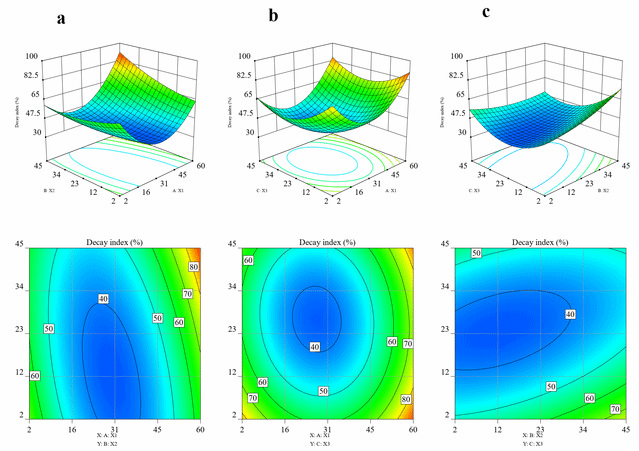 Fig. 1. Response surface plots and contour plots showing the effect of (a) A. argyi EOs concentration (X1) and A. officinarum concentration (X2), (b) A. argyi EOs concentration (X1) and C. dictamni EOs concentration (X3), and (c) A. officinarum concentration (X2) and C. dictamni EOs concentration (X3) on the decay index of peach fruits.