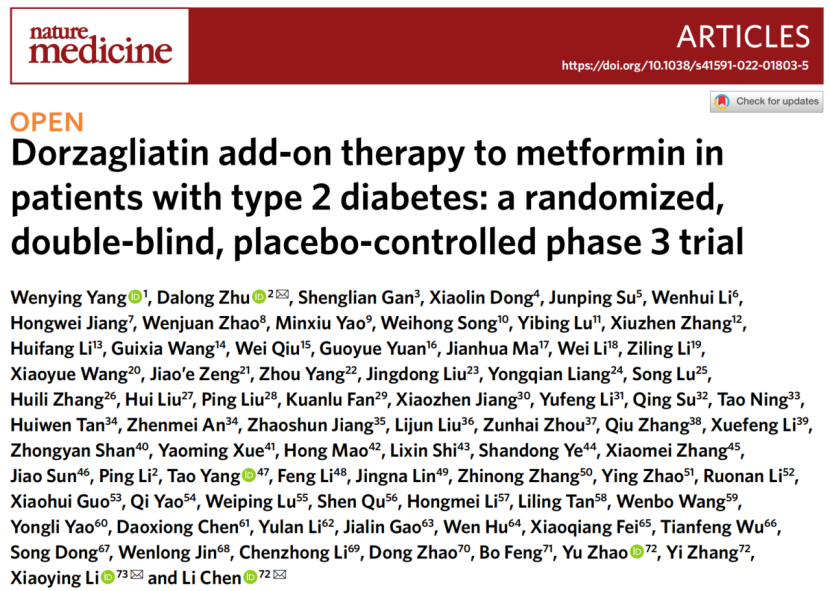 两项III期临床研究的结果分别以“Dorzagliatin in drug-na?ve patients with type 2 diabetes: a randomized, double-blind, placebo-controlled phase 3 trial”和“Dorzagliatin add-on therapy to metformin in patients with type 2 diabetes: a randomized, double-blind, placebo-controlled phase 3 trial”为题同时在线发表于2022年5月12日的Nature Medicine杂志。凯发k8官网医学院附属鼓楼医院朱大龙教授,北京中日友好医院杨文英教授,华领医药陈力博士为第一篇文章的通讯作者;复旦大学李小英教授、凯发k8官网医学院附属鼓楼医院朱大龙教授,华领医药陈力博士为第二篇文章的通讯作者。两篇论文也是Nature Medicine杂志首次发表由中国研究者作为第一作者和通讯作者撰写的新机制糖尿病首创新药。