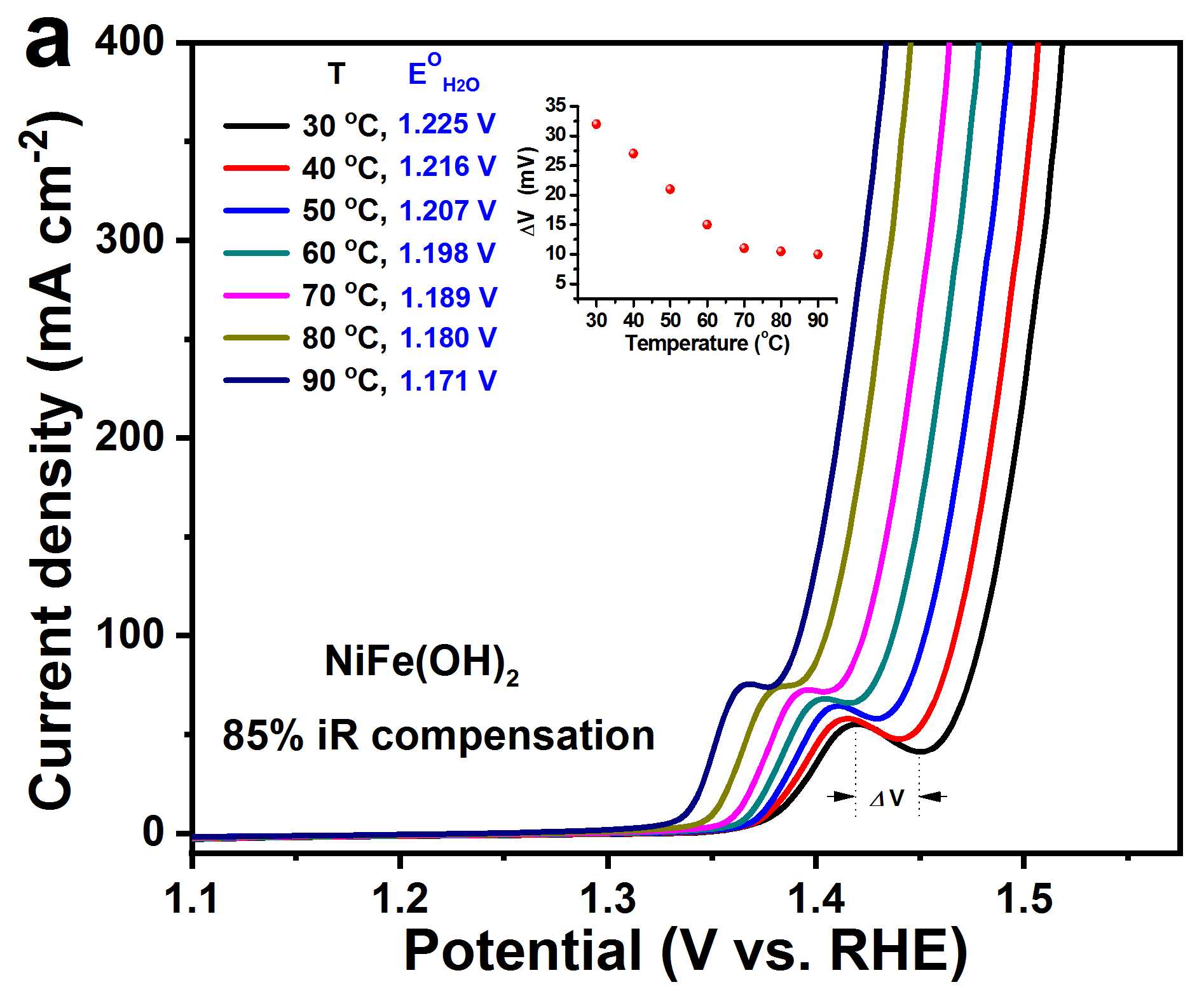 能量之间的耦合增益效应是实现能量转换效率最大化的一种潜在途径,但仍需要探索能量耦合增益的物理机制和材料基础。对于电化学水氧化(OER)反应来说,电子是能量转换的载体,电子化学势的高低决定了能量转换的难易。因此,只有当体系内能量共同改变电子化学势时才能实现高效的能量耦合增益效应。在电化学水氧化极化曲线中,离子氧化Mm+/Mn+ (M< N)电位与OER的之间存在较大电势差(ΔV),表明离子氧化还原电对的离子氧化(速率常数,KM)与水氧化(速率常数,KOER)的动力学差异较大,因此通过加速KM和KOER最小化ΔV(图1a)是加速水分解动力学的一种有效途径,即在氧化还原电对发生氧化后,水氧化反应即刻发生,不存在动力学延迟,此时OER的开启电位即为氧化还原电对的氧化电位(图1b)。以往的OER催化材料设计以调控催化材料电子结构降低电子转移势垒为主要指导思想,研究者提出了包括电子占据态、交换作用、材料结构、晶体场效应等物理参数来描述催化材料的OER催化性能。而实际的电解水反应存在多种物理场(电场、热场、化学场、力场等)耦合作用,其中最主要的是化学反应不可逆热和电之间的耦合效应。引入外部热使得电解池在更高的温度运行,不仅可以实现快速启动,且可降低水分解的理论需求电位,有利于降低反应势垒,从而降低化学反应热,实现快速响应电压波动,提升低电压下的水分解效率。因此热-电耦合是潜在的高效可再生能源制氢方案。