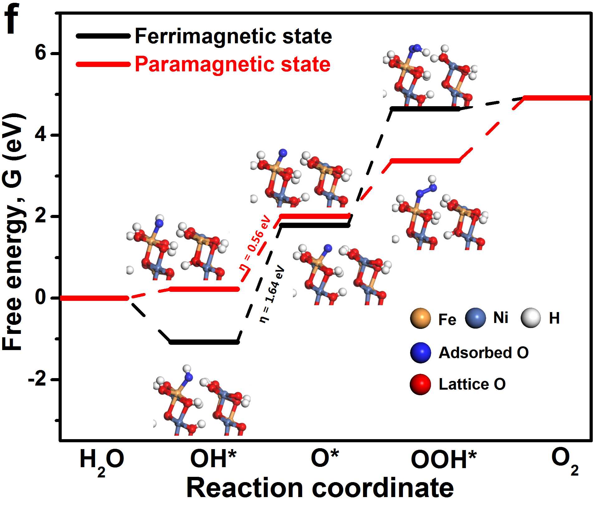 图3. (a) 温度依赖的OER极化曲线。插图为温度依赖的?V,扫速:10 mV s-1,(b) 温度倒数与Ni2+/Ni3+氧化峰值电流对数关系的Arrhenius图。(c) 在T>Tc和Tc时,Ni2+/Ni3+离子氧化与水氧化的能量曲线示意图。(d) 在T>Tc和Tc时电极极化电子能级变化规律。(e)水分解电极电子转移动力学的温度依赖特性。(f)第一性原理求解的顺磁态和亚铁磁态水分解基元步能量需求。