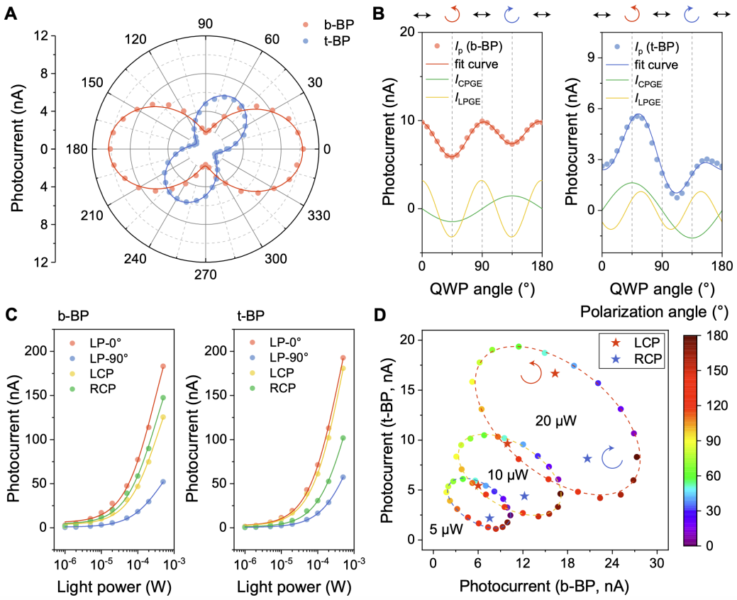 图3 器件对不同偏振光的光电响应。(A)BP偏振测量单元对线偏振光的响应。(B)BP偏振测量单元对圆偏振光的响应。(C)BP偏振测量单元的功率校准曲线。(D)光电流随入射光偏振的变化。