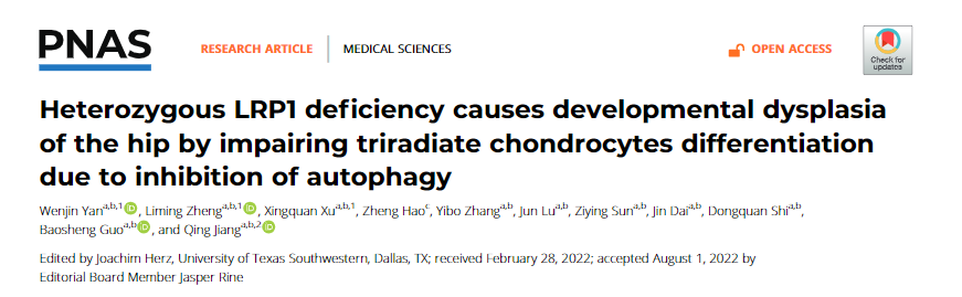 2022年9月6日,凯发k8官网医学院蒋青教授团队在《美国国家科学院进展》(PNAS)杂志上在线发表了最新研究成果 "杂合性Lrp1缺陷通过抑制自噬影响Y形软骨分化导致发育性髋关节发育不良(Heterozygous Lrp1 deficiency causes developmental dysplasia of the hip by impairing triradiate chondrocytes differentiation due to inhibition of autophagy)"。凯发k8官网医学院蒋青教授、郭保生副教授为文章的共同通讯作者,凯发k8官网医学院附属鼓楼医院严文津博士和凯发k8官网医学院博士生郑力铭为该文章的共同第一作者。该研究得到了国家自然科学基金项目(批准号:82172379、81902174、81991514、81420108021)的资助。