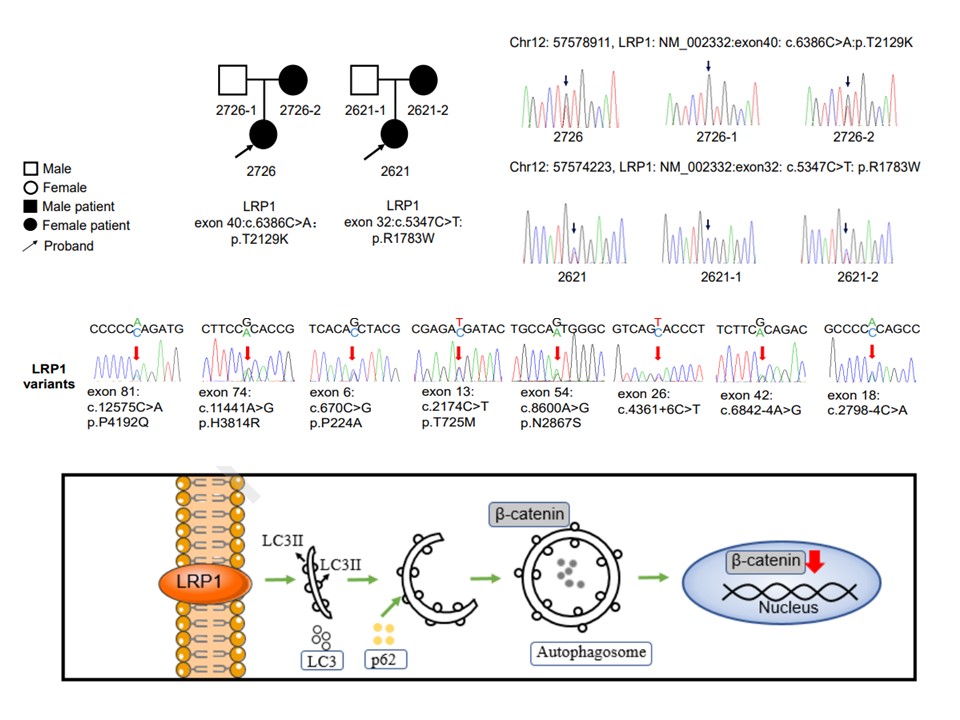 图1. 发育性髋关节发育不良患者LRP1基因杂合突变及其病因学分子机制模式图