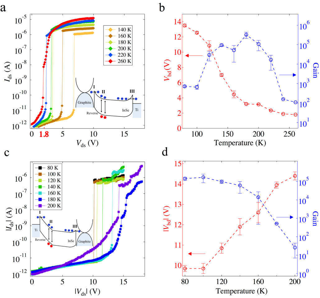图3:(a)不同温度下的Ids-Vds曲线。插图:三个连续的载流子输运过程(注入,电离,和收集)。(b)击穿电压(Vbd)和增益随温度的变化关系。InSe/Ti肖特基结反向偏压时,(c)Ids-Vds特性曲线和(d)击穿电压(Vbd)和增益随温度的变化关系。