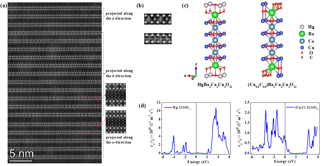 图2. (Cu,C)-1234单晶的(a) HAADF-STEM像和(b) iDPC-STEM像。(c) Hg-1234O11和 (Cu,C)-1234O12的结构模型。(d) 理论计算得到的Hg-1234O11和(Cu,C)-1234O12的c方向电导。