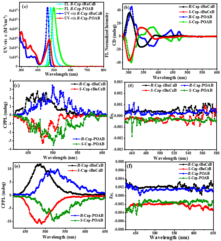 在本工作中,化学化工学院郑佑轩教授和郑文华副教授团队将[2.2]对环(1,4)咔唑啉(Czp)引入到基于叔丁基和酚恶嗪的硼氮多重共振体系中,合成了两对具有平面手性的CP-MR-TADF对映体 (R/S)-Czp-tBuCzB和(R/S)-Czp-POAB。由咔唑、吩恶嗪和其他基团组成的刚性结构与苯基上的硼原子以特定方式排列,有利于实现S1和T1之间小的能隙(ΔEST)和窄的发射光谱。其在甲苯中的发射峰值分别为478和497nm,FWHM分别为23和36nm,掺杂膜中的光致发光量子产率分别高达98%和93%。基于(R/S)-Czp-tBuCzB的CP-OLED的电致发光(EL)光谱半峰宽仅为24 nm,最大外量子效率达到32.1%,当亮度达到1000 cd/m2时,效率滚降仅为3.7%,这在蓝光CP-OLED中是最小的。而基于(R/S)-Czp-POAB的器件显示了基于CP-MR-TADF材料的第一个近纯绿色的CPEL,发射峰为513 nm,CIE坐标为(0.23,0.65)。两种CP-OLED都显示出对称的CPEL光谱,|gEL|因子分别为1.54×10-3和1.30×10-3。