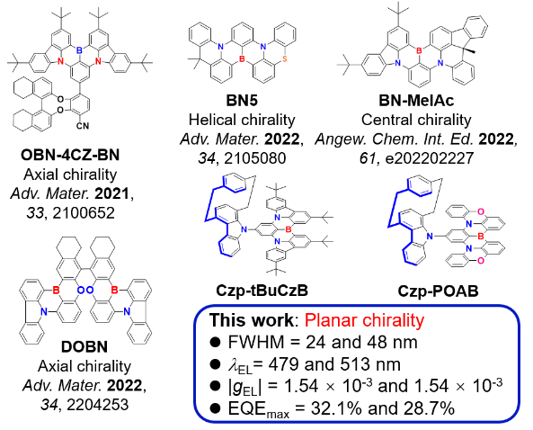 多重共振TADF(MR-TADF)发光材料通过缺电子硼/羰基和富电子氧/氮产生共振效应,使前沿分子轨道的键合/反键合最小化,以减少稠环结构的振动弛豫,从而导致窄的FWHM和高的发光效率,多数显示优异的OLED器件性能。因此,手性MR-TADF(CP-MR-TADF)材料具有制备高性能和优异色纯度CP-OLED器件的潜力。然而,到目前为止,关于这类材料的研究还十分有限,并且主要集中在轴手性、螺旋手性和碳中心手性方面。然而,作为重要的手性元素之一,平面手性在CP-MR-TADF材料领域仍然未被报道。