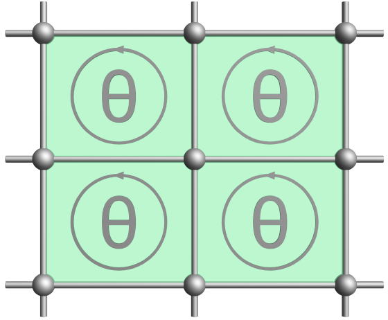 对称性是现代物理学最基本的原理之一。1939年,维格纳揭示了,在量子力学中对称群将被投影表示。群的投影表示是指,群乘法运算被相位因子所修正,即ρ(g1)ρ(g2)=eiθ(gz,g2)ρ(g1,g2).维格纳将这一原理应用于庞加莱群,给出了基本粒子的分类。庞加莱群是高能物理中的时空群,与之对应,固体物理中的时空群是空间群和时间反演不变性。但一般晶体的教科书中,只涉及晶体对称性的一般表示理论,而不讨论投影表示。原因在于晶体对称性理论是为了研究电子晶体而发展起来的,普通的表示理论对于大多数应用已经足够。 但近年来,人工晶体的尖端技术,包括光子和声学晶体、光晶格中的冷原子和机械周期系统使情况发生了改变——这些人工晶体在晶格上具有可设计的规范通量构型,它们将荷载晶体对称性的投影表示。一个规范场下对称性被投影表示的例子如下图:在每个方格子中施加一定规范通量θ时,平移算符 之间的代数关系将被修改为投影对称代数:LaLbLa-1Lb-2=eiθ.