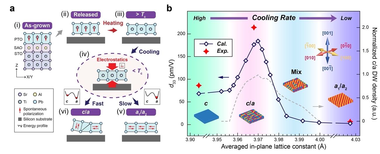 为实现具有高纵向压电系数的低维材料,聂越峰教授课题组尝试制备高质量自支撑铁电氧化物PbTiO3(PTO)薄膜并将其转移至硅基底上以探究其压电性的调控。实验发现,通过热处理过程实现了多种铁电畴结构(c、c/a、a1/a2畴),同时获得了大范围可调的纵向压电系数。与传统的通过外延衬底对薄膜施加应变进行畴结构调控不同,本工作则是通过对自支撑薄膜进行退火处理来获得不同的畴结构。对于PTO外延薄膜,由于受到单晶衬底在面内方向的束缚作用,极化指向面外方向的c畴是最稳定的状态。将具有c畴结构的PTO薄膜借助水溶性牺牲层的办法从衬底上剥离,可获得无衬底钳制的自支撑薄膜,此时自支撑薄膜仍然具有c畴结构。当温度升高至居里温度以上时,PTO从铁电四方相转变为顺电立方相,但在降温的过程中重新转变为四方铁电相且形成新的畴结构。由于存在面外方向的退极化场,面外极化的c畴处于亚稳态而极化指向面内方向的a(a1/a2)畴则是能量更低的稳态。通过调控降温速率,可以调节c畴和a畴的比例,慢速降温过程可以让晶格和极化有足够时间弛豫至更稳定的a(a1/a2)畴结构,而快速降温则可以获得含有亚稳态的c/a混合畴(图1a)。洪家旺教授课题组通过相场模拟,揭示了PTO畴结构转变规律,同时计算了不同畴结构所对应的纵向压电系数d33。理论和实验结果表明,类比于准同型相界(MPB)附近可获得较高压电性,在具有c/a混合畴结构的自支撑PTO薄膜中可以获得高达214 pm/V的纵向压电系数,这是块体PTO纵向压电系数的2.5倍(图1b)。另外,值得一提的是,研究还显示c/a混合畴的压电效应是纯面内极化a(a1/a2)畴的30倍,展示了在同一种材料中可以通过简单的热处理即获得对其压电效应大范围的调控。