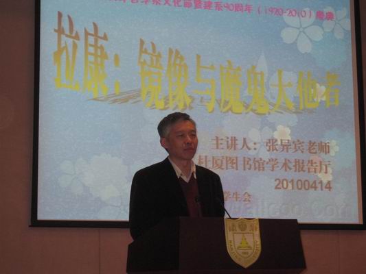 谁是拉康?相信对后现代主义、精神分析学感兴趣的同学对这位“法国的弗洛伊德”不会陌生。4月14日晚上,在仙林图书馆报告厅,学校党委常务副书记、哲学系博导张异宾教授举行了一场题为“拉康——镜像与魔鬼大他者”的学术讲座,从而拉开哲学系文化节暨建系90周年庆典的序幕。