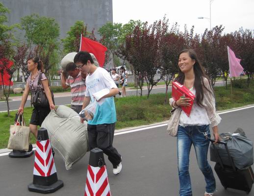 最壮观的场面要数迎新专车的停车处,那里聚集了每个院系的迎新队伍。每当一辆迎新车辆从校门口驶入,这一群三三两两分散的队伍就会以神速集合到路边,他们高举本院的标志牌,士气高昂,精神抖擞,大叫着本院的名称,吼着独具本院特色的迎新口号,喜滋滋地将新生带往大本营,然后再度返回,乐此不疲。相信所有走进校园的新同学和家长们都会被我们足足地震撼和感动了一把。
