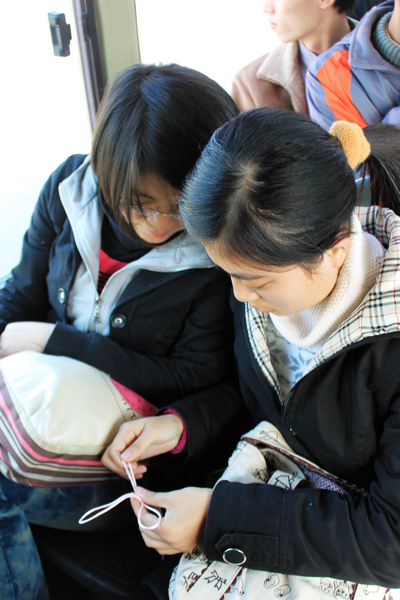 在去幼儿园的路上,认真的同学抓紧最后的时间学习中国结的制作。