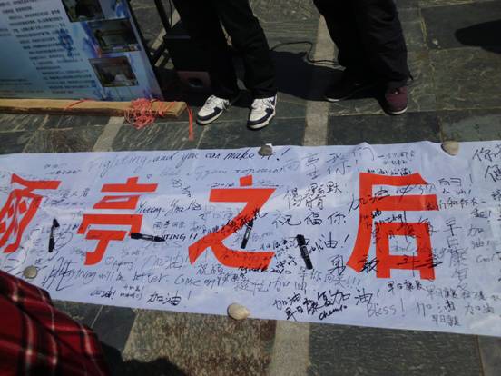 活动当中还有一块写着“雨亭之后,必有彩虹”的横幅,所有想表达自己美好祝愿的同学都可以在上面签下自己的祝福和心愿。届时,这块横幅会送给杨雨亭同学,让他感受到同学们的力量。