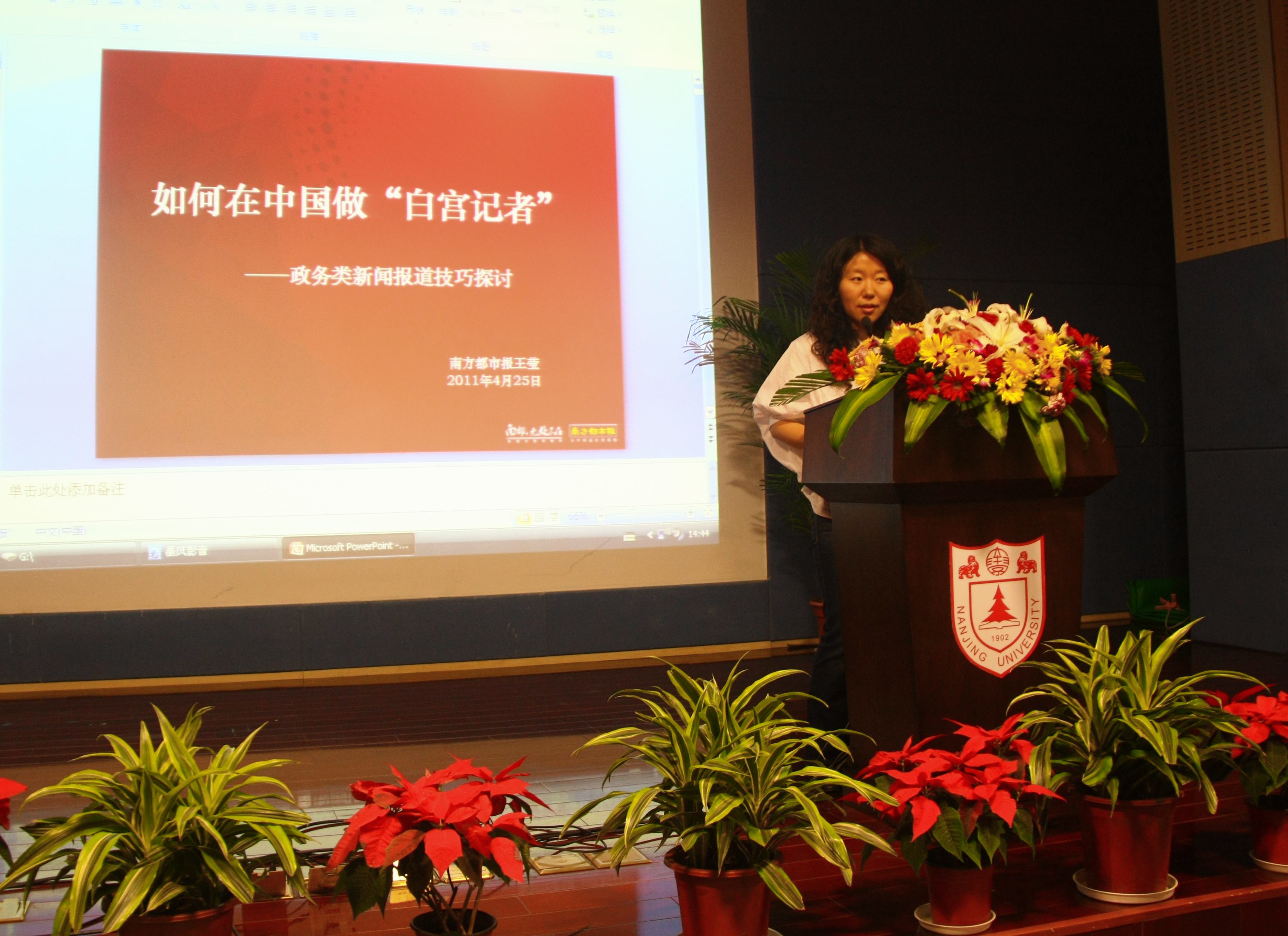 2011年6月17日下午两点半,在新闻传播学院综合演播厅内,一场别开生面的讲座拉开了序幕。南方都市报时事新闻中心首席记者王莹为同学做了一场主题为“如何在中国做白宫记者——政务类新闻报道技巧探讨”的演讲。