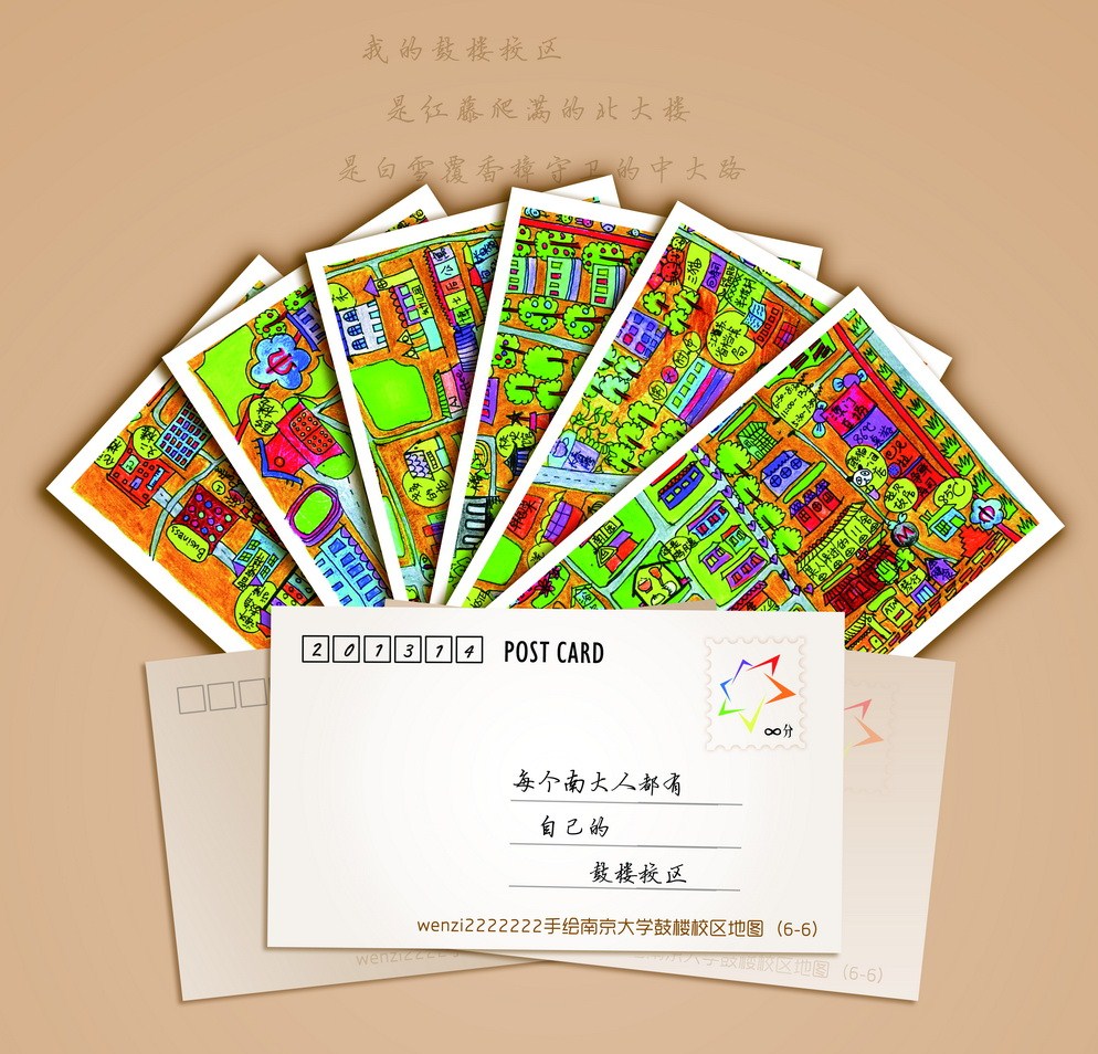 这套明信片图案是凯发文学院戏剧专业一名女生手绘的鼓楼校区地图,她从开始创作到完成,只用了短短一个多月时间。绘制完成后,她用“wenzi2222222”的账号将所作4张16开拼合地图上传至凯发小百合BBS上。可爱的造型、熟悉的地名、加上无意的“错别字”,让这张手绘地图受到了小百合网友的热捧,不少同学纷纷询问什么时候能把它印成明信片。