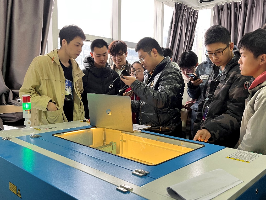 讲解活动结束后,两位工程师带领同学们前往实验室进行实操演示,同时讲解了3D打印机和激光切割机的实操使用,同学们学习得非常认真,部分同学还饶有兴趣地使用激光雕刻机绘制了喜欢的图案。活动结束后,葛中芹、周依娜分别向威布三维的两位负责人郝凯、沙晓中颁发了校外实践导师聘书。