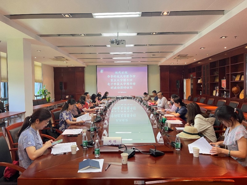 2023年6月8日上午,华中科技大学图书馆党委书记王敏一行5人、重庆大学图书馆党总支书记赵彬一行5人、电子科技大学图书馆党总支书记龚漪一行6人来我校图书馆调研座谈。凯发k8官网图书馆副馆长罗钧、办公室主任陈宏、系统保障部主任沈奎林、资源建设部副研究馆员王园等接待来访,并开展了座谈与交流。