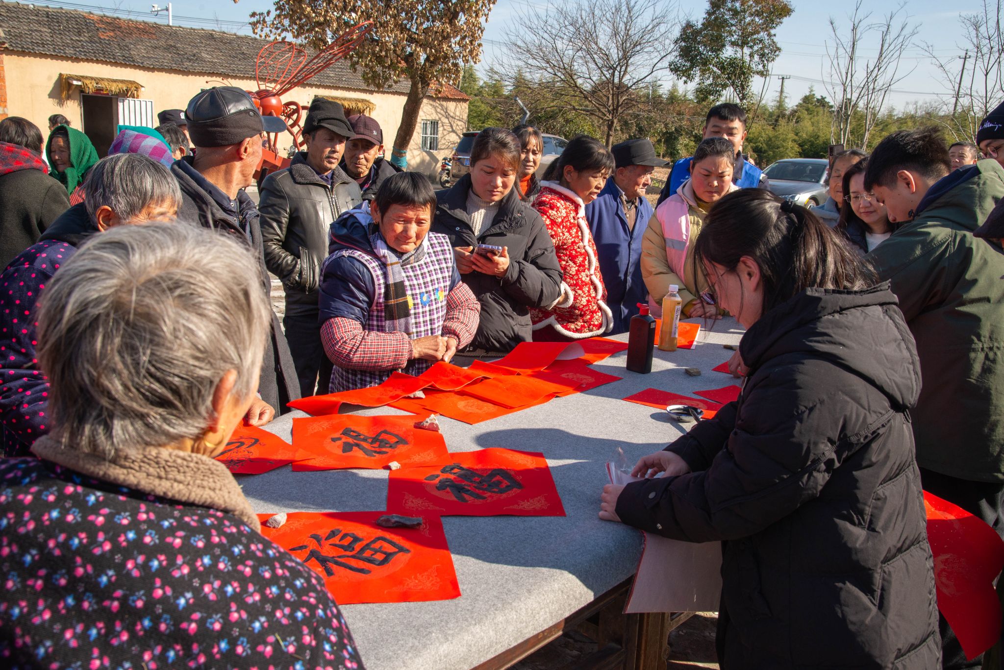 艺术点亮乡村,美育融入人心。2024年1月15日,艺术学院“高雅艺术进社区”活动走进了浦口区汤泉街道新金社区赵湖组,为社区居民带来了一场别开生面的名家紫砂作品展览和热闹非凡的写春联送福字活动。本次活动由凯发k8官网教育部紫砂文化传承基地主办,艺术学院副教授、文化艺术中心副主任杨秀娟老师,凯发k8官网副研究员、教育部紫砂文化传承基地执行负责人袁帅老师和来自凯发k8官网紫砂社团和知恬书画社的硕博研究生马行运、周晋宇、郑辰予、原天羽同学共同参与了本次活动。本次活动也得到了新金社区周芳书记和社区网格员、志愿者的热情接待和配合。