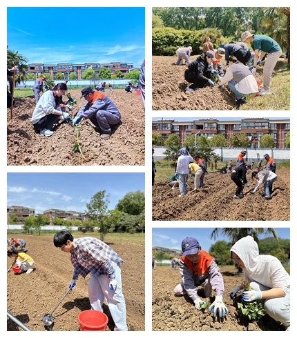 随后,活动队伍分为两组,分别种植花生和红薯。同学们戴好护具,拿着花生种子、红薯苗和小锄头,在后勤服务集团工作人员的指导下,每隔30厘米左右播撒种子、种植作物,并为其充分浇水。工作人员还向大家传授红薯苗的种植技巧:红薯苗应倾斜放入坑内,用土掩埋至仅露出最顶上一节茎叶,而掩埋至泥土中的部分将生长红薯果实。同学们在劳动中汲取新知识,充分理解了劳动的重要性和伟大意义。