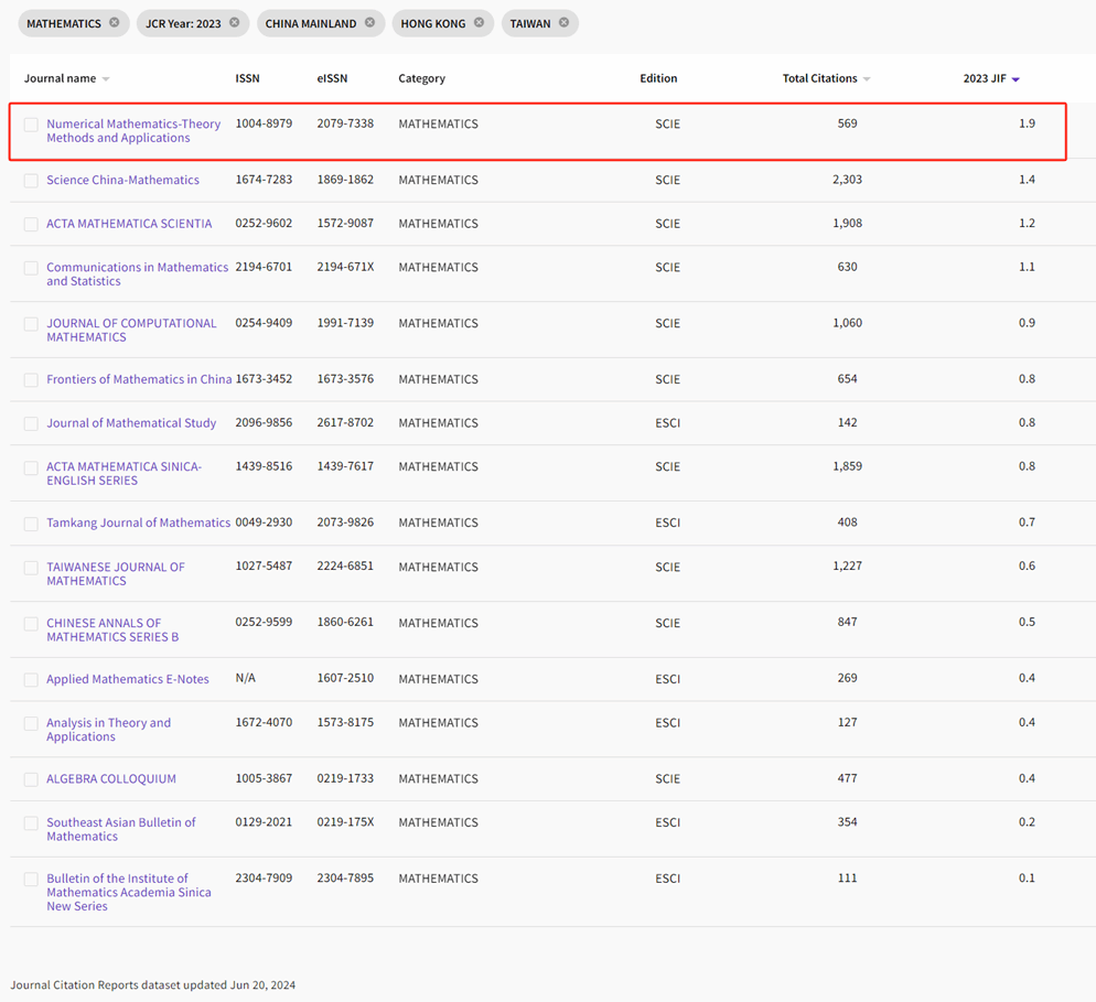 近日,科睿唯安(Clarivate Analytics)发布了2023年期刊引证报告(JCR2023)。报告中,Numerical Mathematics: Theory, Methods and Applications (该刊中文名为《高等学校计算数学学报<英文版>》),最新影响因子为1.9,在全球489种数学SCI期刊中位列第34位,位居Q1分区,在国内数学SCI期刊中排名第一。