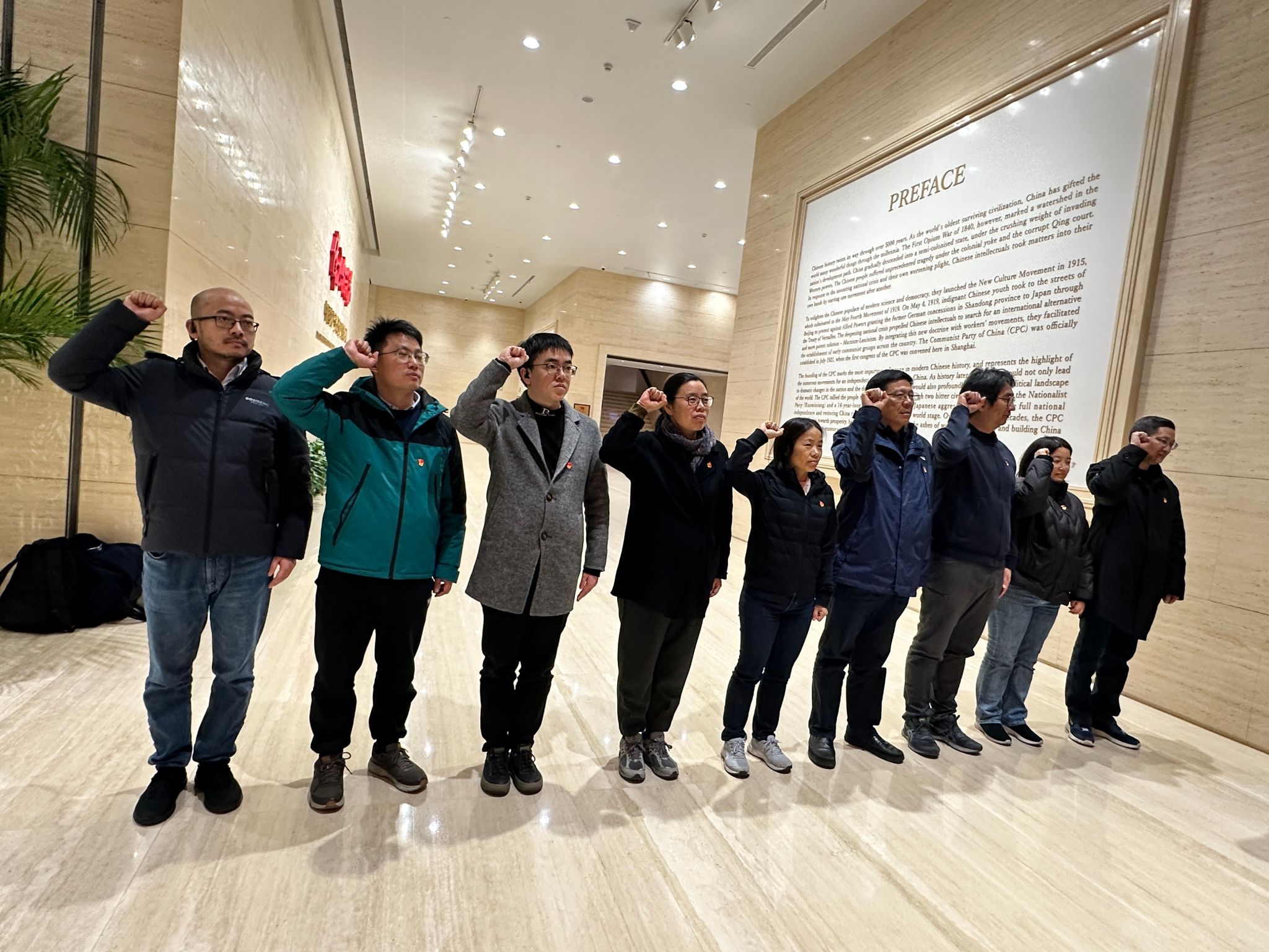 活动首站来到中国共产党人的精神家园——上海中共一大会址。支部成员们通过纪念馆内珍贵的历史文物、影像资料及全息投影场景复原,沉浸式回顾了中共一大召开的历史背景与中国共产党诞生的伟大历程。在回顾这段波澜壮阔的历史进程后,支部成员走进了庄严肃穆的宣誓大厅,全体党员面向鲜红党旗,在江静的领誓下,以铿锵之声重温入党誓词。“我志愿加入中国共产党……”铮铮誓言在纪念馆内回响,传递着新时代高校教师党员对党的信仰与忠诚。