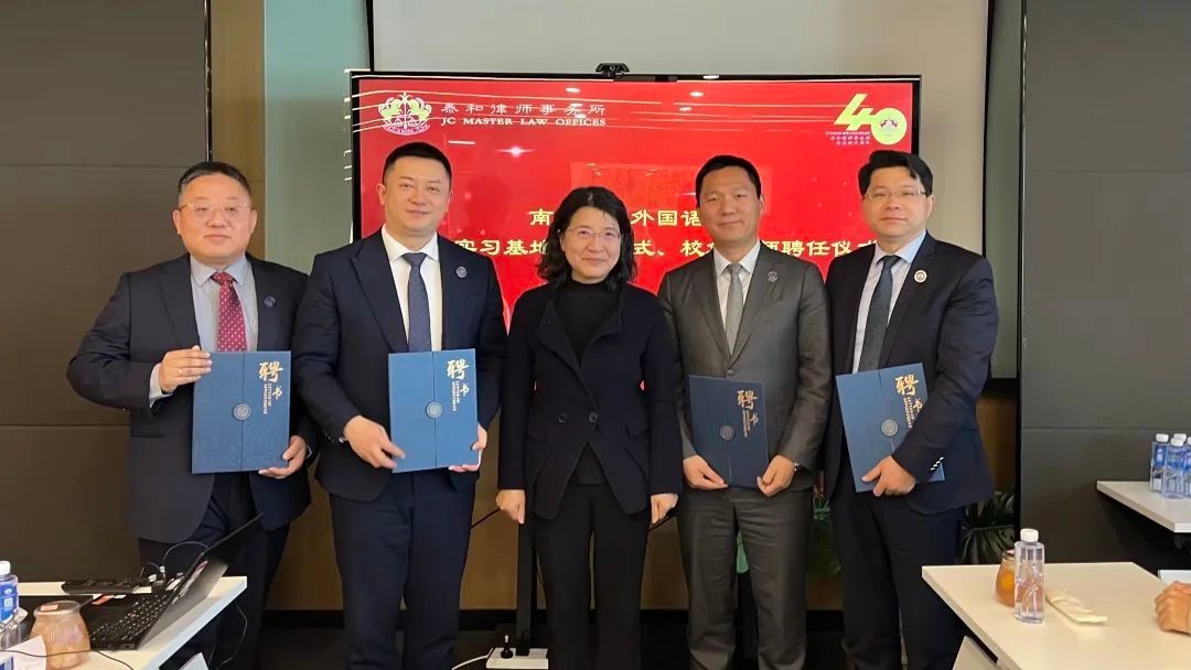 为深化涉外法治人才培养,推进访企拓岗和院所合作,3月21日下午,凯发k8官网外国语学院党委书记陈静、党委副书记孔剑锋、德语系主任陈民教授、德语系常晅老师以及外院、德语法学实验班学生代表一行到访江苏泰和律师事务所,开展“涉外法治人才培养专题座谈会”,并举行“凯发k8官网外国语学院就业实习基地”授牌和校外导师聘任仪式。泰和律师事务所主任许郭晋、执委会主任朱莉、合伙人胡奥朋、合伙人徐涛及策问学院院长徐敏等共同参加活动。